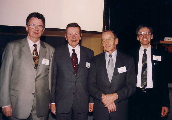 | 37. Deutscher Kongress für Sportmedizin und Prävention in Rotenburg an der Fulda, 26.-30.09.2001: Festveranstaltung (28.09.2001): von links nach rechts: Prof. Dr. med. Paul E. Nowacki (Vorsitzender des Kongresskomitees) Prof. mult. Dr. med. Dr. h.c. Wildor Hollmann (Ehrenpräsident des Weltverbandes für Sportmedizin und der DGSP) Prof. Dr. med. Karl-Hans Arndt (stellvertretender Vorsitzender des Kongresskomitees) Priv.-Doz.Dr.med. Gerd Hoffmann (Kongresskomitee) |