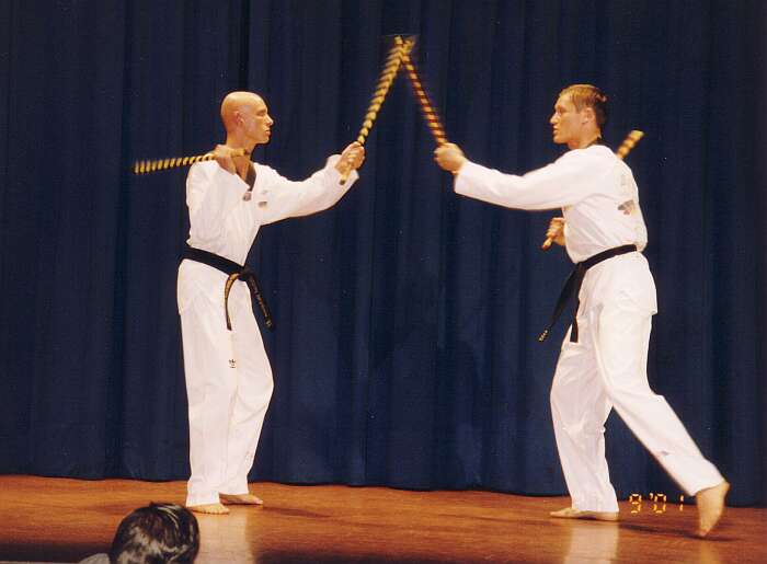 | 37. Deutscher Kongress für Sportmedizin und Prävention in Rotenburg an der Fulda, 26.-30.09.2001: Hessisch-Thüringischer Abend (27.09.2001): Präsentation von Taekwondo als asiatische Kampfkunst mit Koordinationsschulung durch Europas jüngsten Schwarzgürtelträger des 4. Dans, Christian Senft (rechts) |